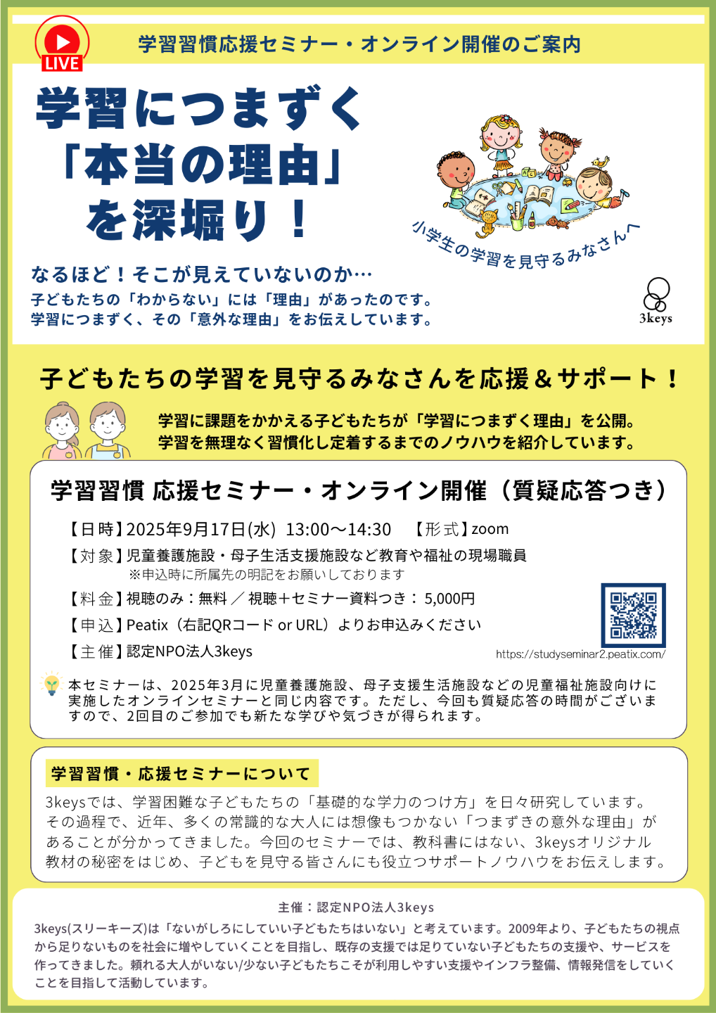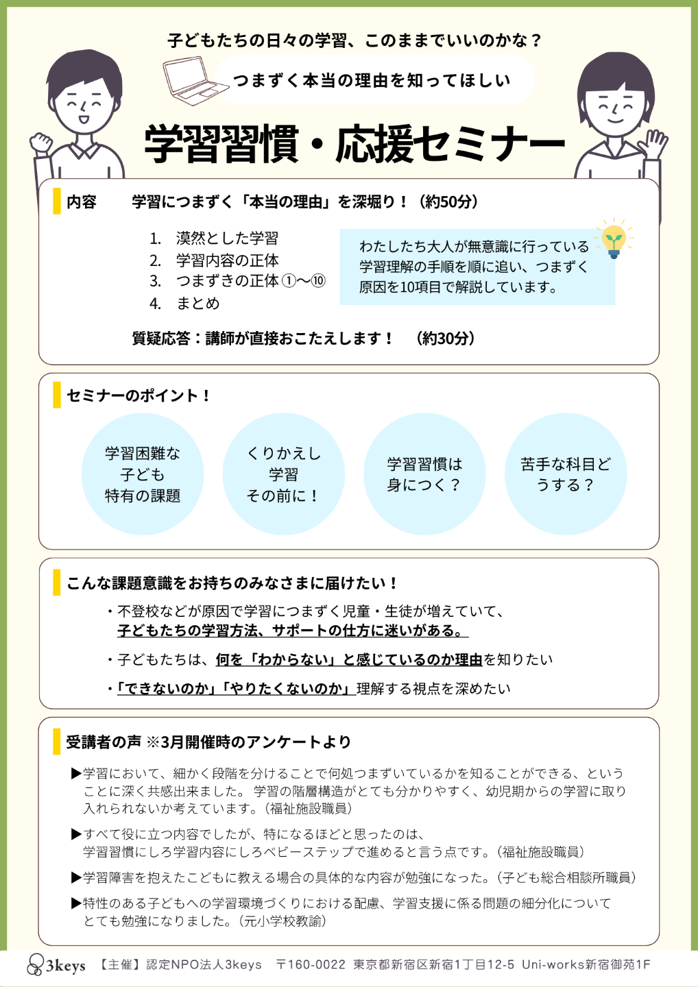 学習に課題をかかえる子どもたちの「つまずき」を発見し、無理なく習慣化、定着するまでのノウハウを紹介するセミナーです。